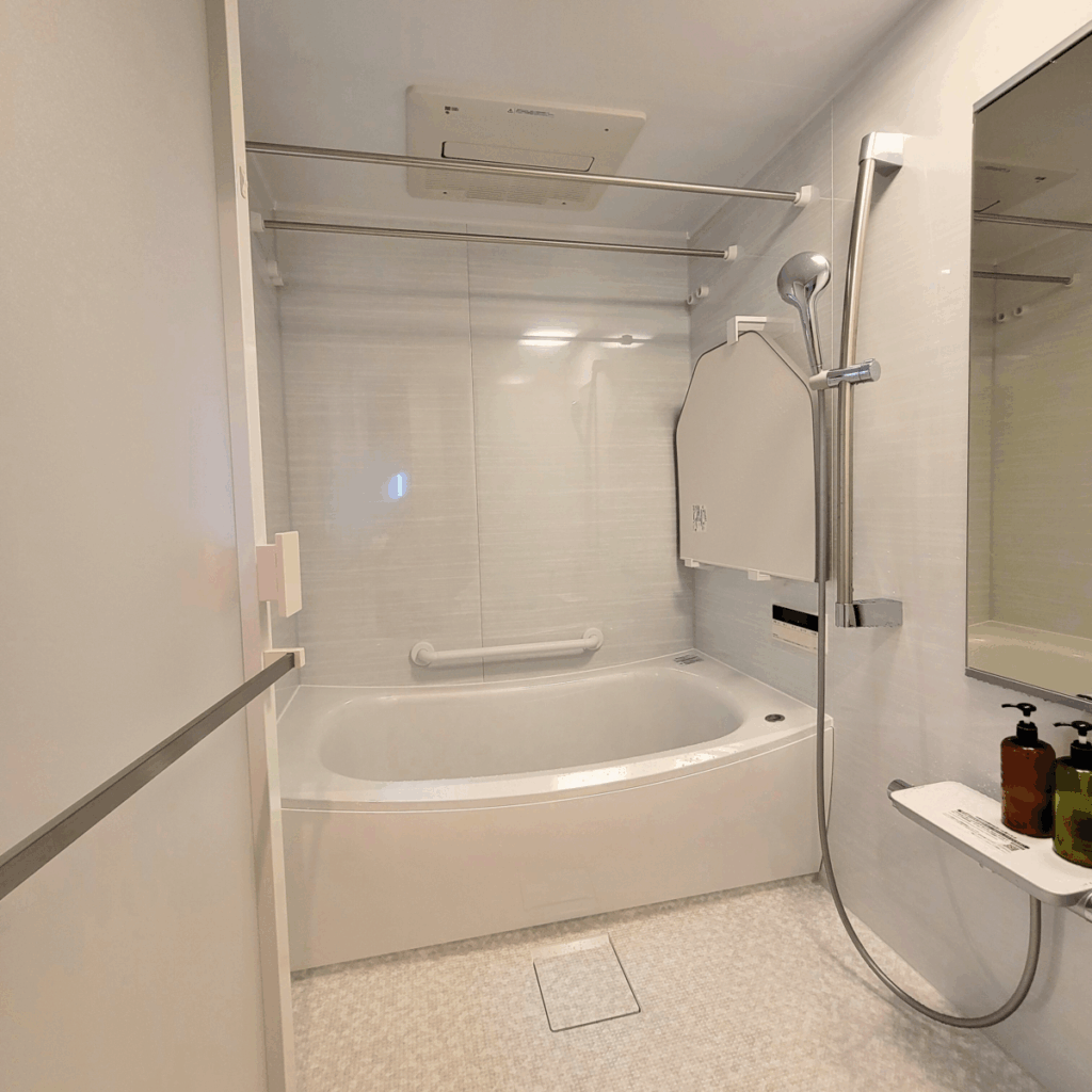 スライドバー付きシャワーや2本の物干しバーを新設し、日常の使いやすさを向上。