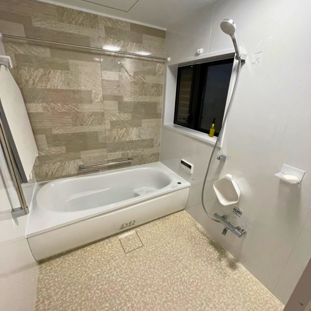 石目調のアクセントとゆったり浴槽で、一日の疲れをやさしく癒せる空間に生まれ変わりました。