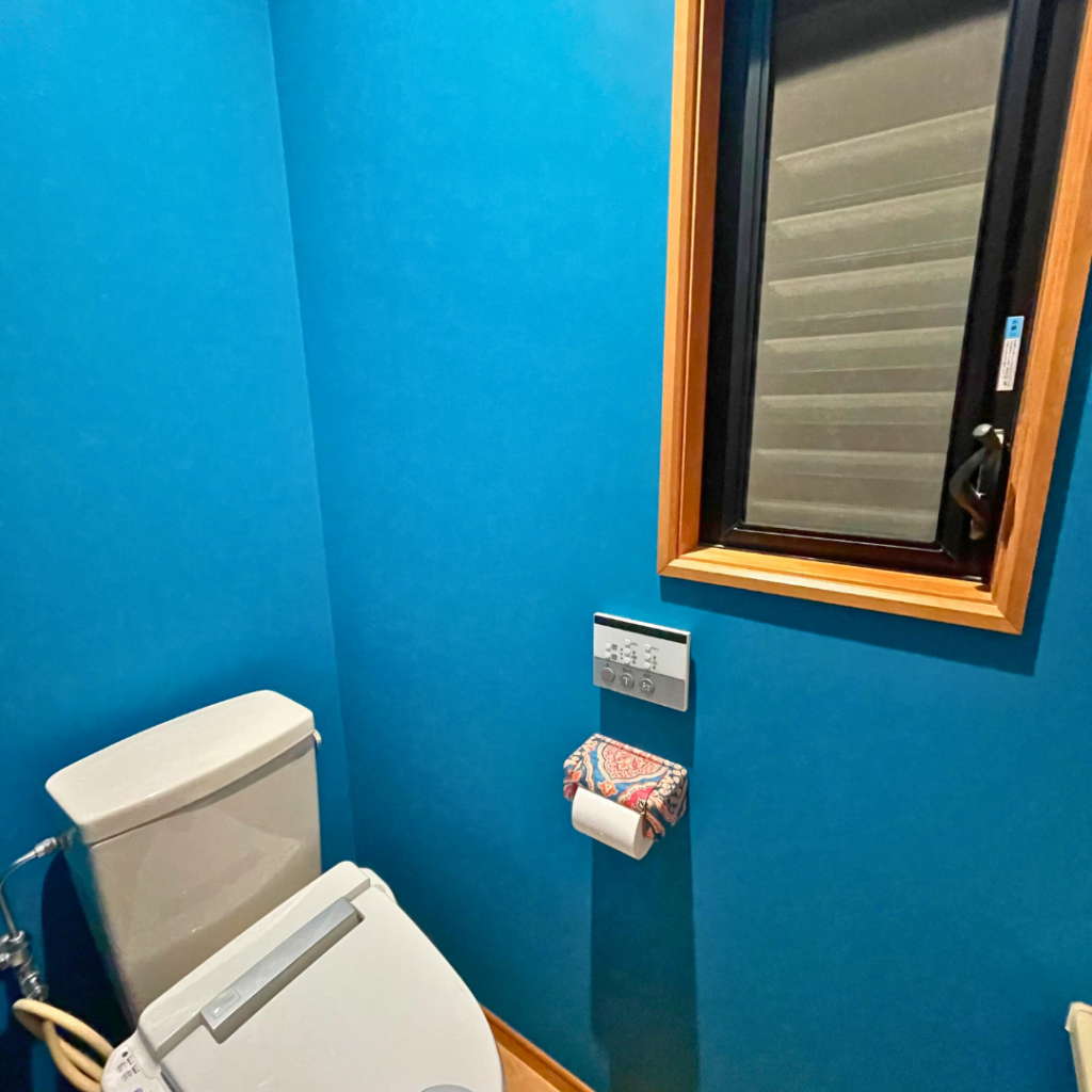 深みのあるターコイズブルーを採用し、床や窓枠の木の質感と調和することで、空間全体が引き締まった、印象的なトイレへと生まれ変わりました。