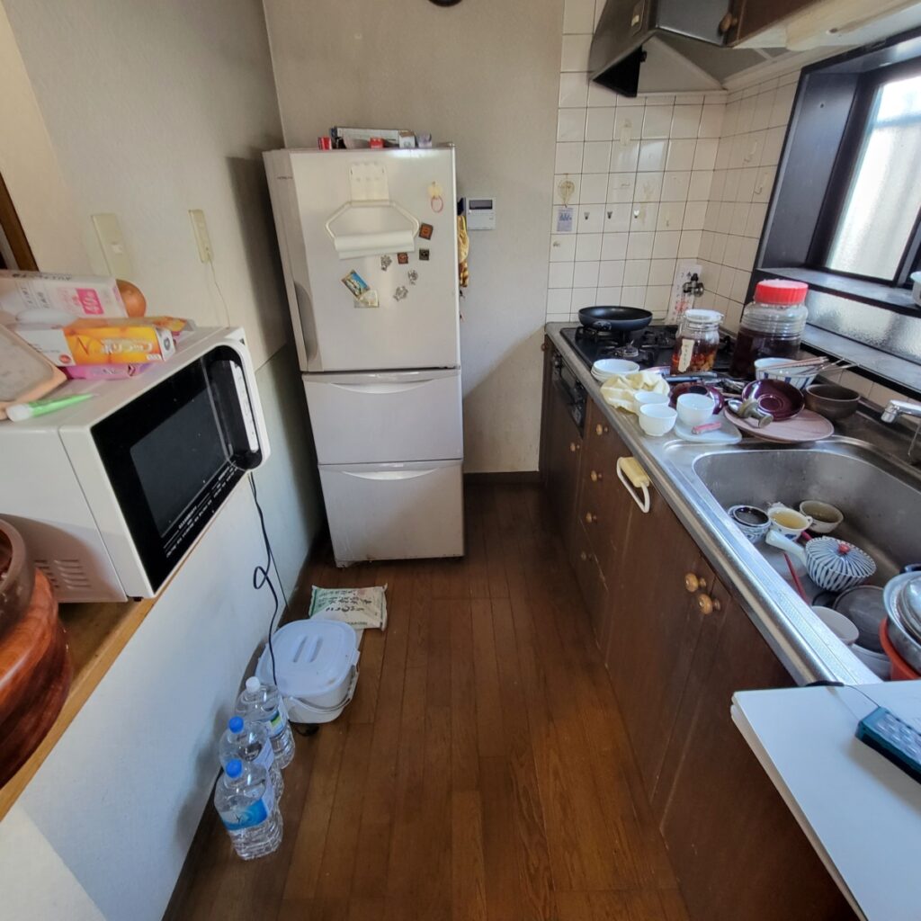 キッチンは収納量や作業スペースが限られ、物が表に出やすい状態でした。