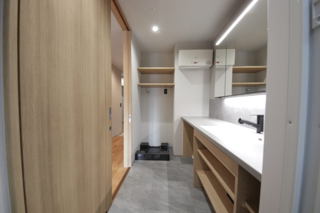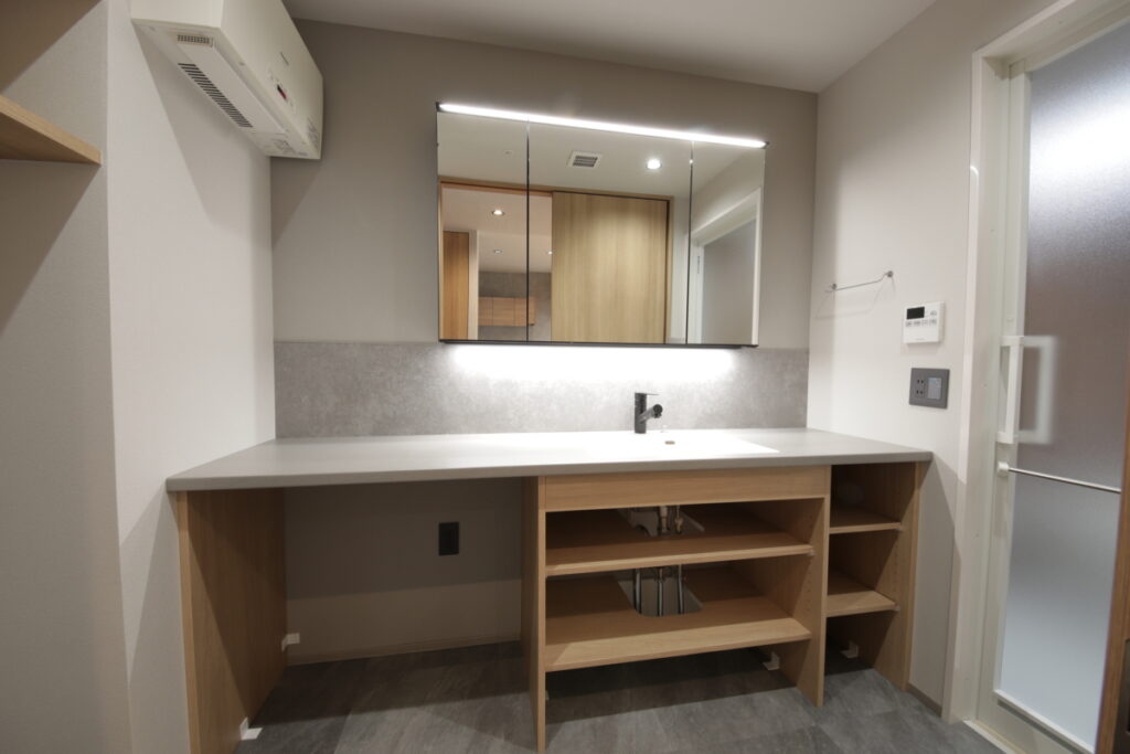 一方で、洗面や周辺動線については日常の使い方とズレが見られたため、住まい全体の流れの中で関係性を整理する計画としました。